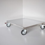 Строительная тележка “Мини” . Грузоподъёмность тележки составляет 240 кг и не смотря на скромные габариты и вес, она с лёгкостью перемещает любые грузы, будь то емкость со штукатуркой или несколько упаковок тяжеленного керамогранита. Тележка оборудована 4 прорезиненными колёсами, 2 из которых оборудованы специальными стопорами, надёжно удерживающими её от несанкционированных перемещений. Так к примеру на неё спокойно можно ставить пустую ёмкость для штукатурки, прямо на тележке производить замес и уже затем перекатывать емкость с раствором в нужное место. Или к примеру при укладке плитки на пол, положив на тележку несколько упаковок плитки, она всегда будет под рукой и следовать за вами в процессе выполнения работы. В общем теперь не нужно бегать за каждой плиткой или рвать спину чтобы перетащить груз из комнаты в комнату. Строительная тележка “Мини” от Рик-сталь, традиционно выполнена из нержавеющей стали .